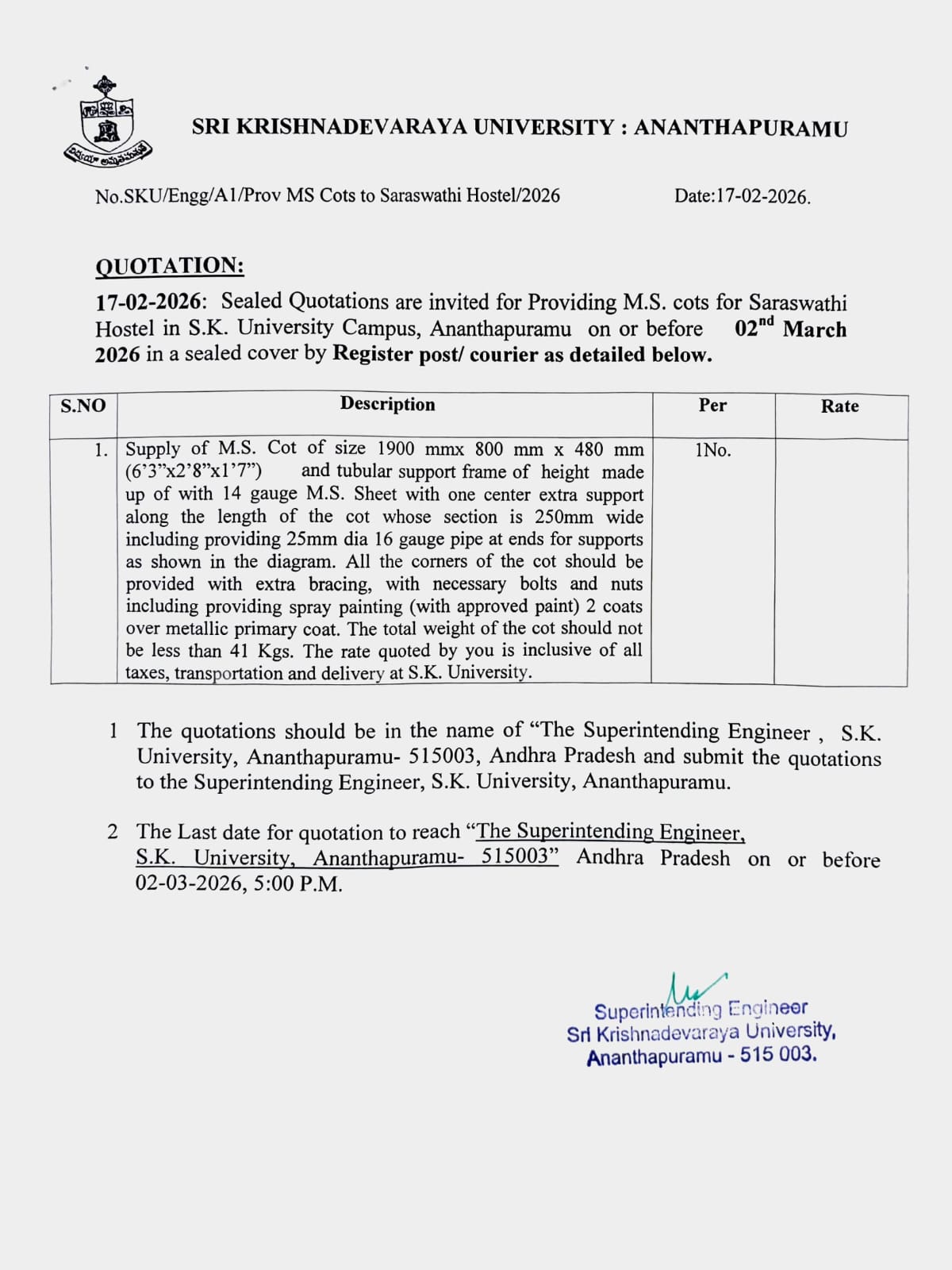 Local Tender: Sealed quotations are invited from interested Local Printers of Ananthapuramu town only for 2000 copies of (1).USIC Job Applications (Form-l). (2).Required Component (Form-ll) and (3).lob Card & Iob dompletion Certificate (Form-lll) for Dept.of Instrumentation & Uslc of S.K.University, Academic Year 2022-23.